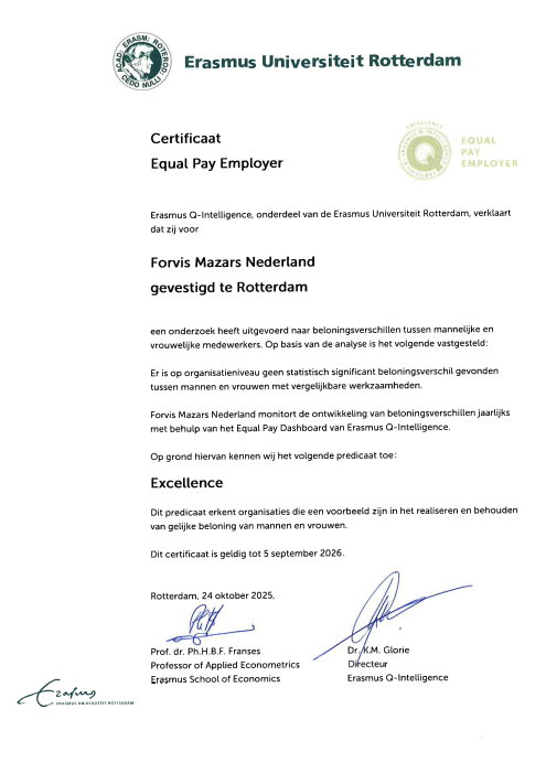 Bij Forvis Mazars geloven we in gelijke kansen voor iedereen. Daarom zijn we trots dat we voor het derde jaar op rij het ‘Excellence’-certificaat van Erasmus Q-Intelligence hebben ontvangen. Dit certificaat bevestigt dat collega’s, ongeacht gender, bij ons gelijk worden beloond voor gelijk werk.